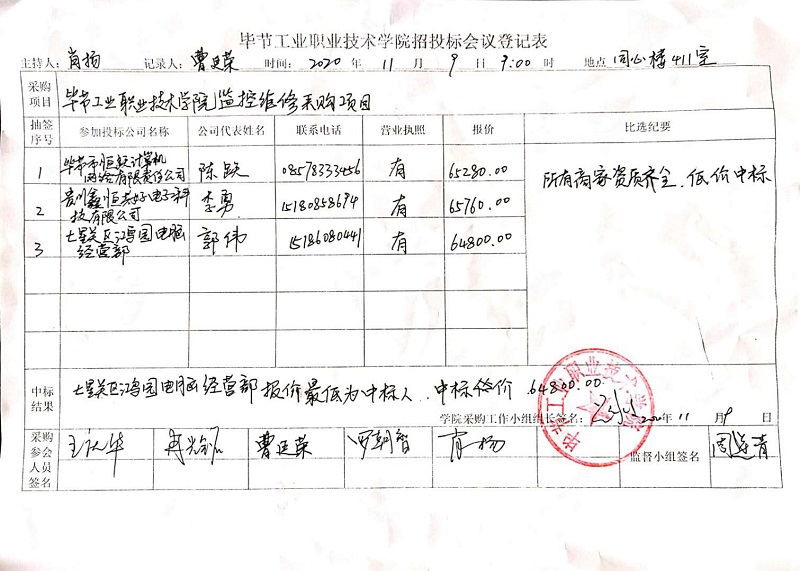畢節(jié)工業(yè)職業(yè)技術(shù)學(xué)院監(jiān)控維修采購項(xiàng)目中標(biāo)公告
