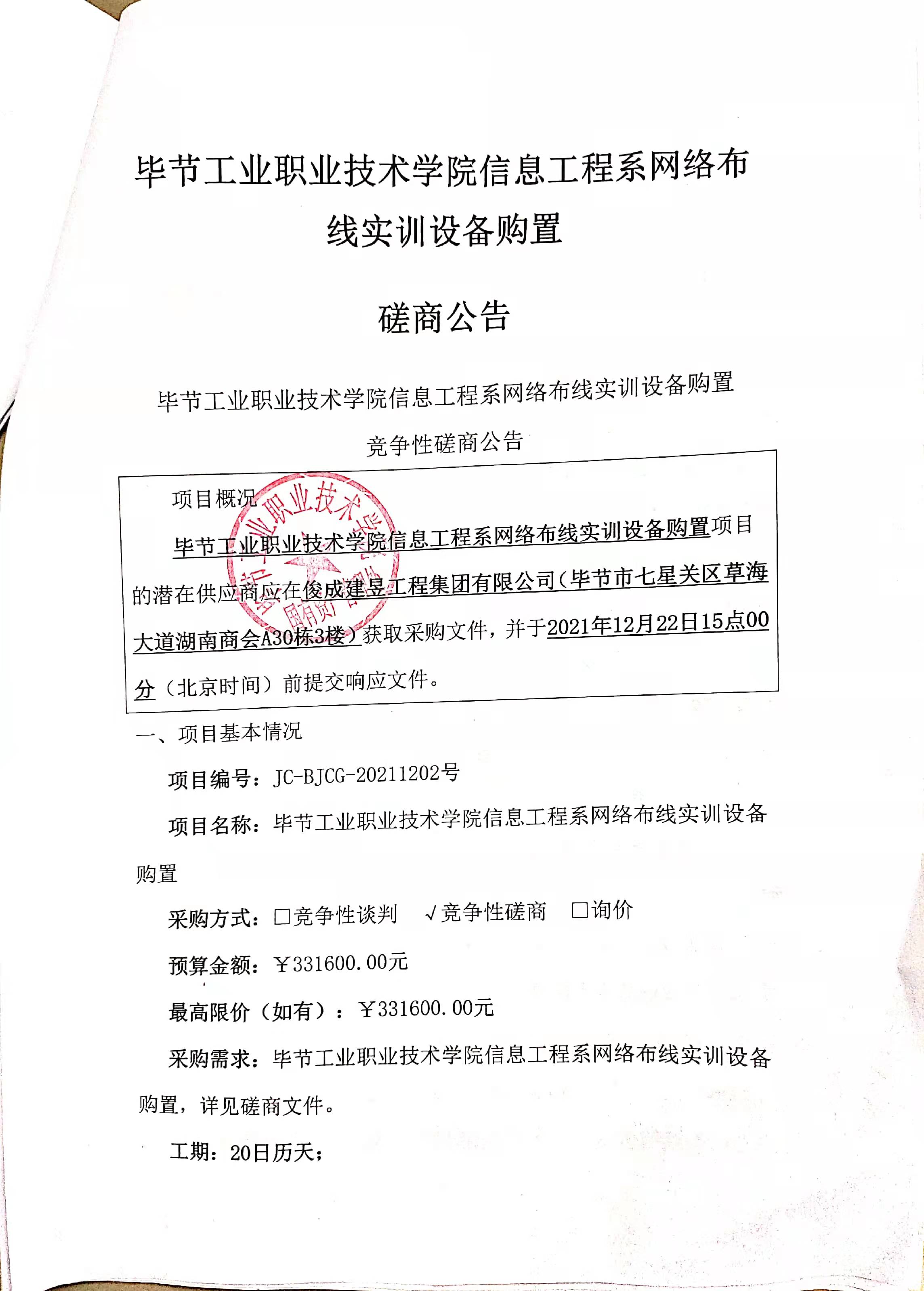 畢節工業職業技術學院信息工程系網絡布線實訓設備購置磋商公告
