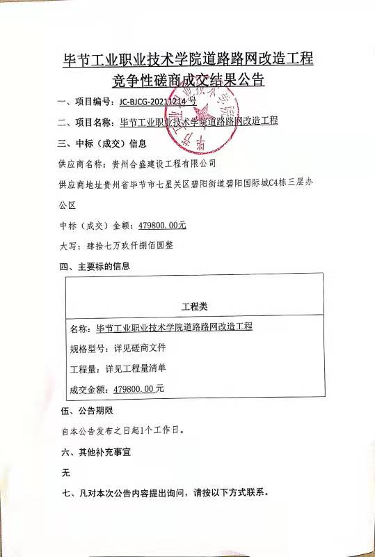 畢節工業職業技術學院道路路網改造工程競爭性磋商成交結果公告