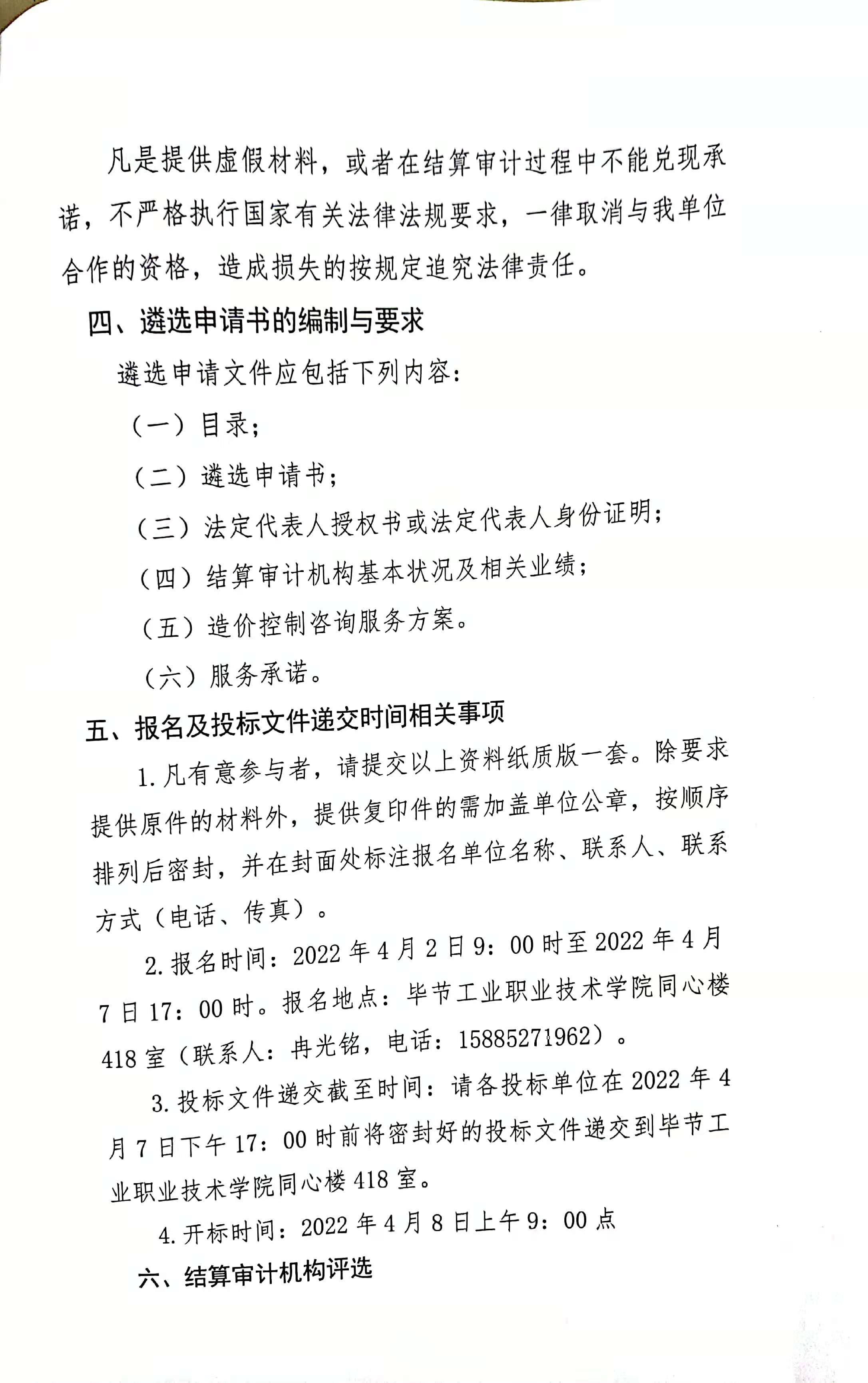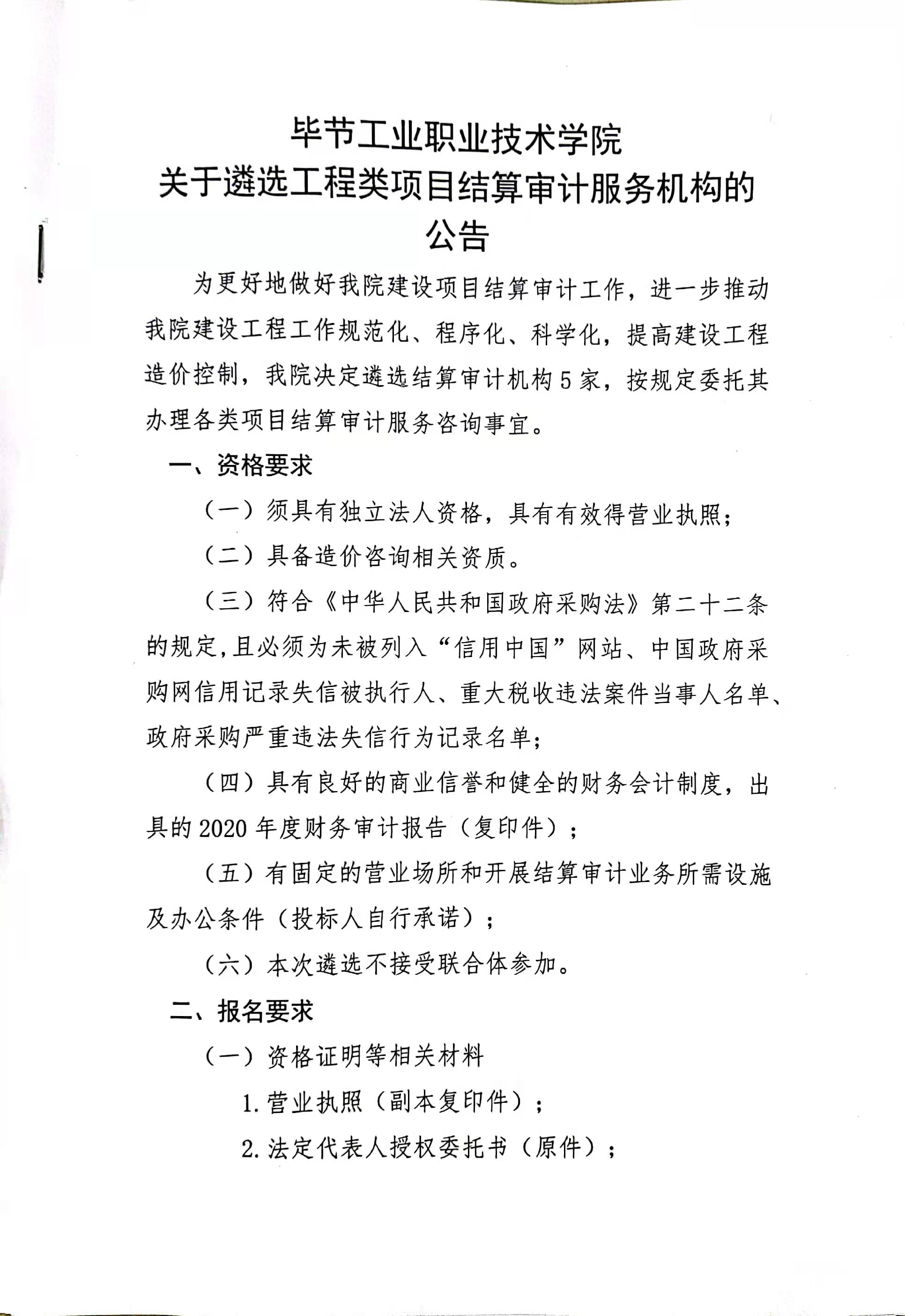畢節工業職業技術學院關于遴選工程類項目結算審計服務機構的公告