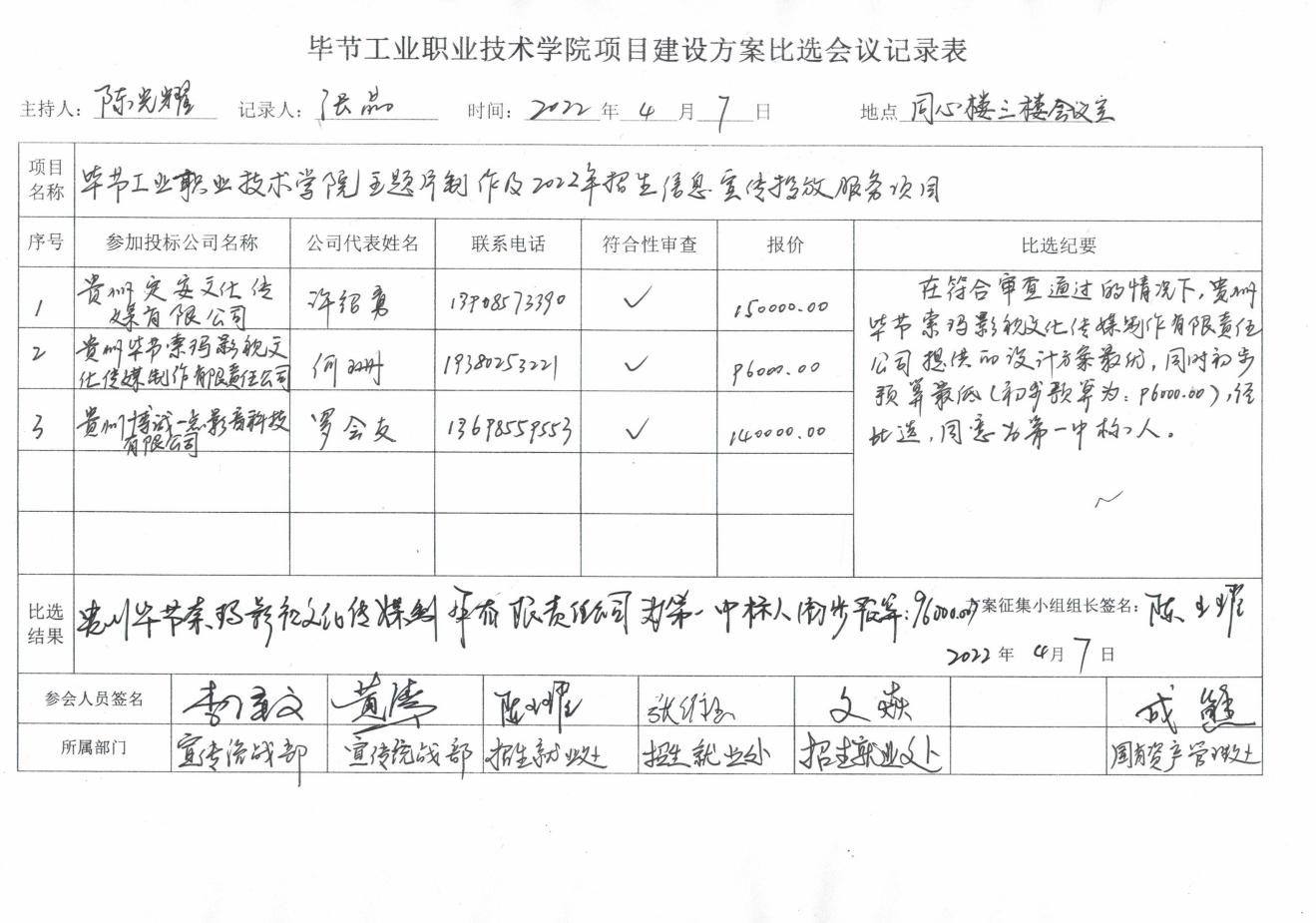 畢節工業職業技術學院主題片制作及2022年招生信息宣傳投放服務項目方案比選結果公示