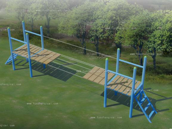 項目描述:模擬當年紅軍"飛奪瀘定橋"的情景,站在10米的高空處,憑借人體自我平衡,跨過一段"一根走繩和兩根扶繩組成的鋼絲橋。