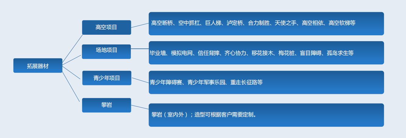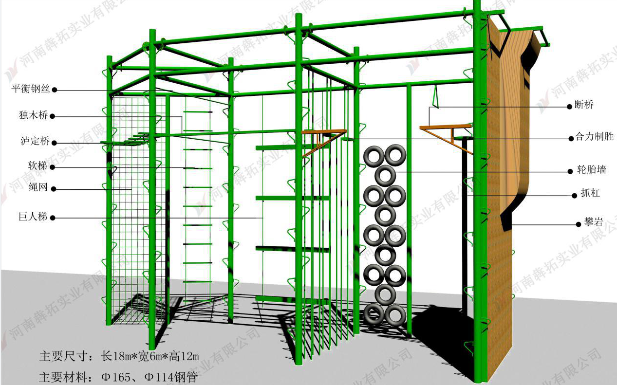 2、項目功能:培養個體責任感、奉獻精神,自我挑戰和突破能力;培養行動前群策能力,以及調查研究、認真計劃的精神,學習在緊急情況下進行有效溝通,激發創造力;培養在短時間內有計劃解決問題的能力;學習目標的確立、學會為自己負責,實現自我監控,增強團隊凝聚力;增強個體的手臂、腰部、腿部力量、身體協調能力與平衡力。