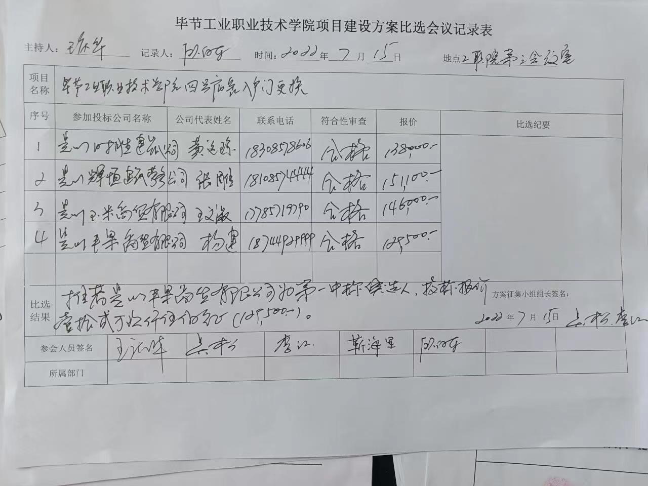 畢節工業職業技術學院四號宿舍入戶門更換比選結果公示