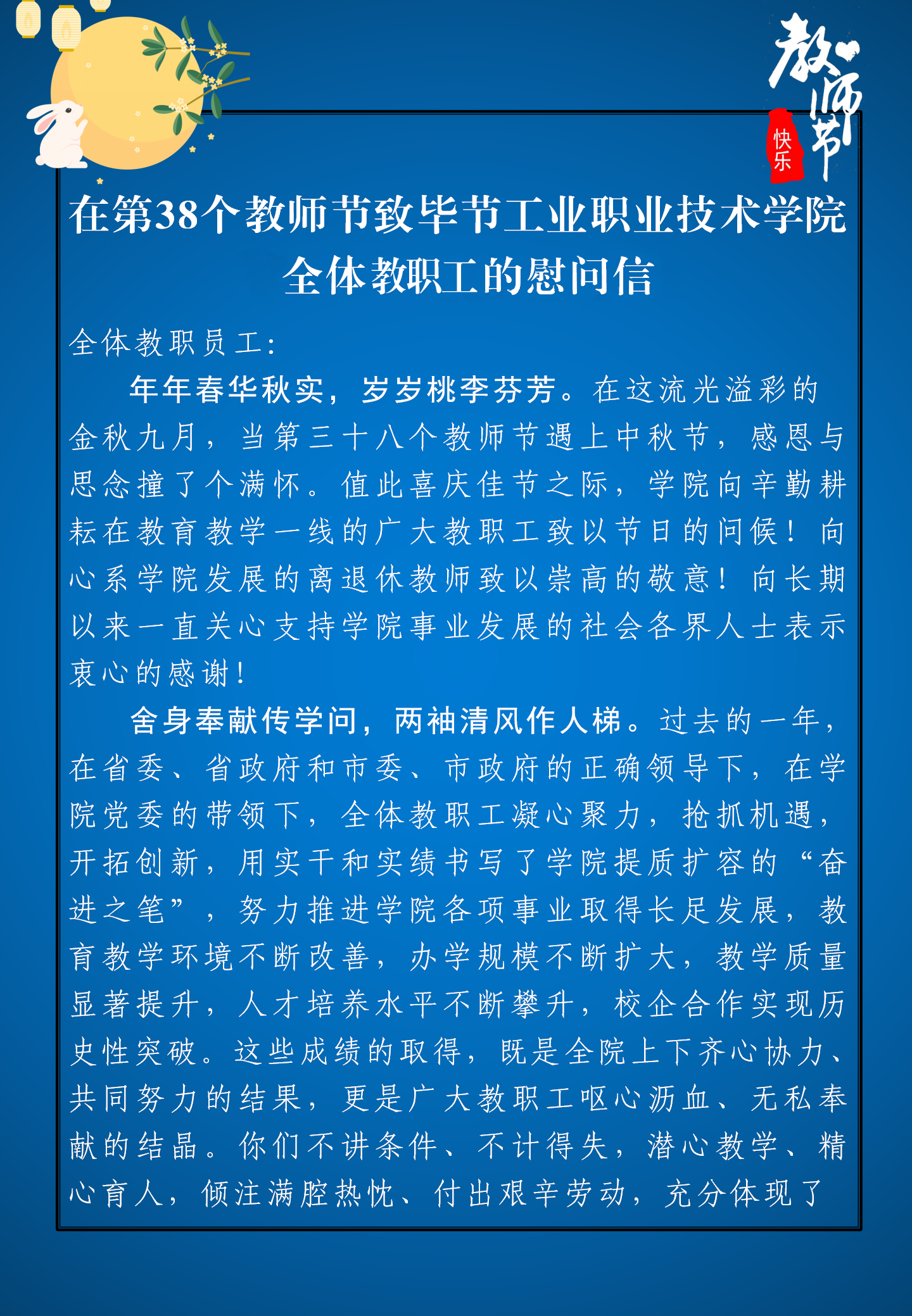 在第38個(gè)教師節(jié)致畢節(jié)工業(yè)職業(yè)技術(shù)學(xué)院全體教職工的慰問信