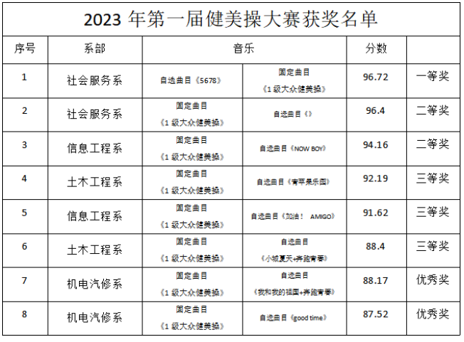 一個個優(yōu)美的身影 在田徑場上翩翩起舞 把青春之美展現(xiàn)得淋漓盡致 青春的力量 在陽光下燦爛 悅耳動聽的旋律 輕盈曼妙的舞姿 在賽場上紛紛呈現(xiàn) 在此次健美操大賽中 參賽選手們?yōu)闃s譽而拼搏 為整個集體貢獻(xiàn)自己的力量 為自己的青春努力拼搏 精彩的表演結(jié)束后 通過評委的公正打分 共評選出八個獲獎參賽隊伍 祝賀獲獎隊伍和指導(dǎo)老師 愿大家一如既往、再接再厲