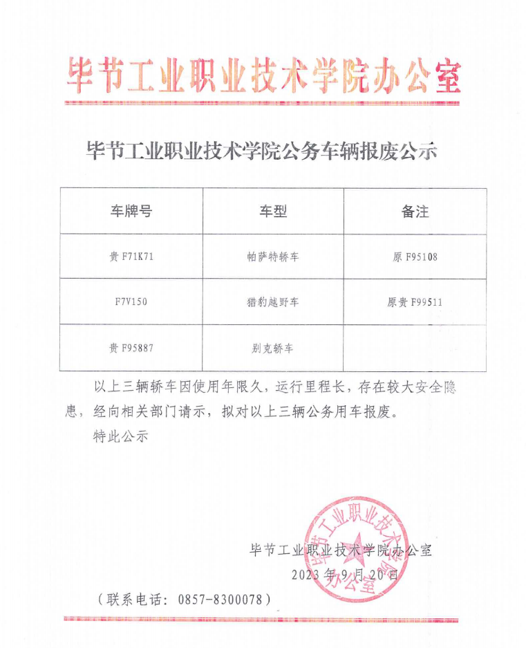 畢節(jié)工業(yè)職業(yè)技術(shù)學(xué)院公務(wù)車(chē)輛報(bào)廢公示