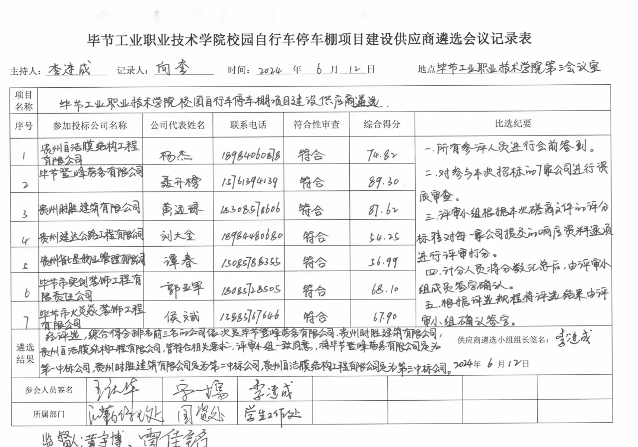 畢節工業職業技術學院校園自行車停車棚項目建設供應商遴選結果公示