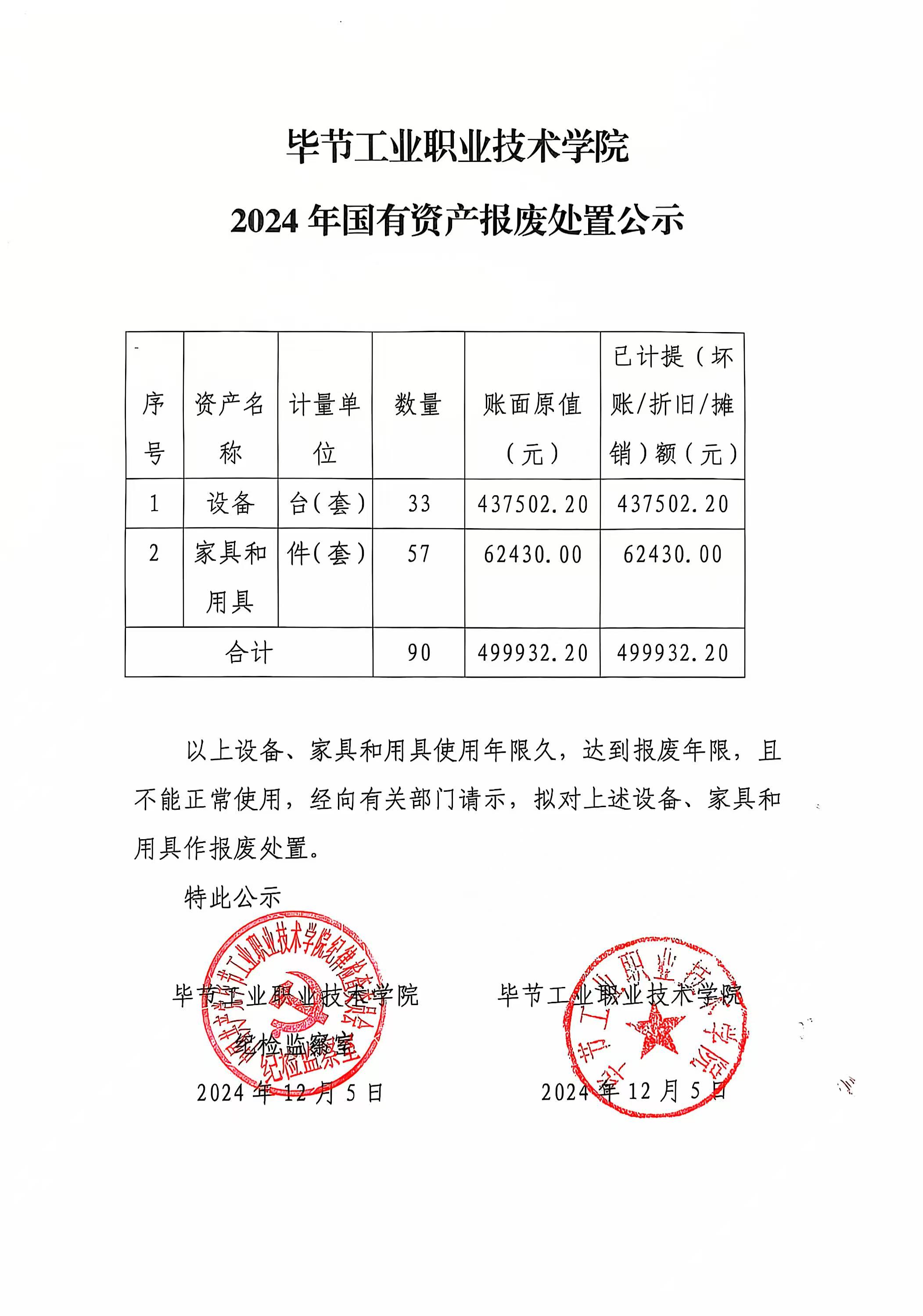 畢節工業職業技術學院2024年國有資產報廢處置公示