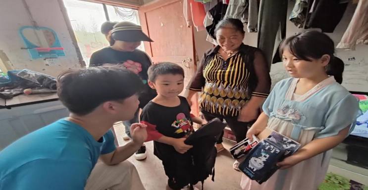 圖為實踐隊成員給留守兒童送上書包及學習用品