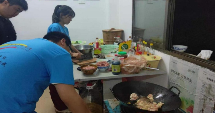 在沙灣村村委的極力支持下,實踐團隊打地鋪、四支團隊輪流進行外出采買物資,做飯。
